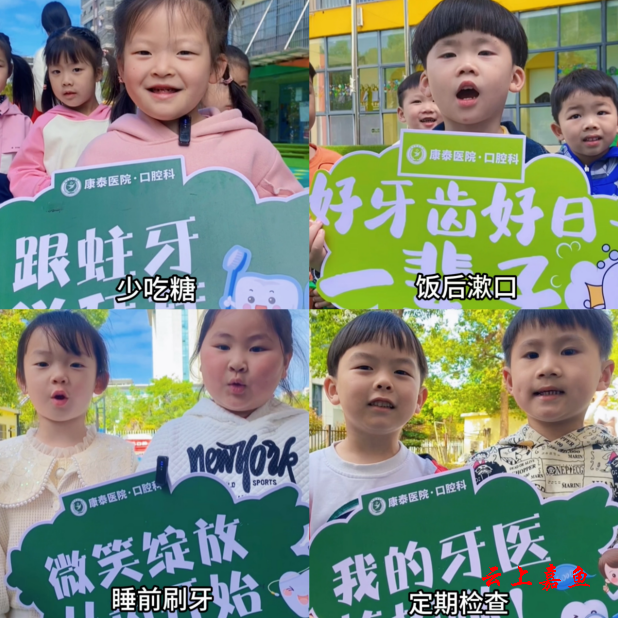 “小朋友们,要少吃糖、饭后漱口、睡前刷牙、定期检查喔!”幺米幺米幼儿园公益小天使拿着指示牌说。