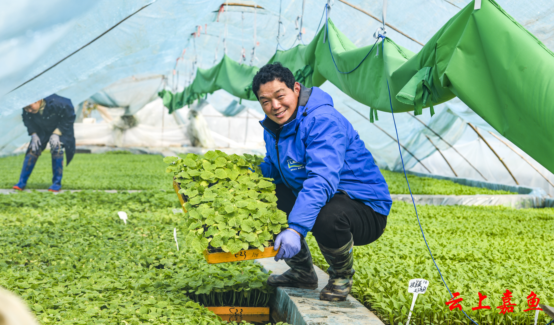 在位于新街镇的嘉鱼富德蔬菜合作社,工人正在实施水上漂浮育苗 雷平 摄