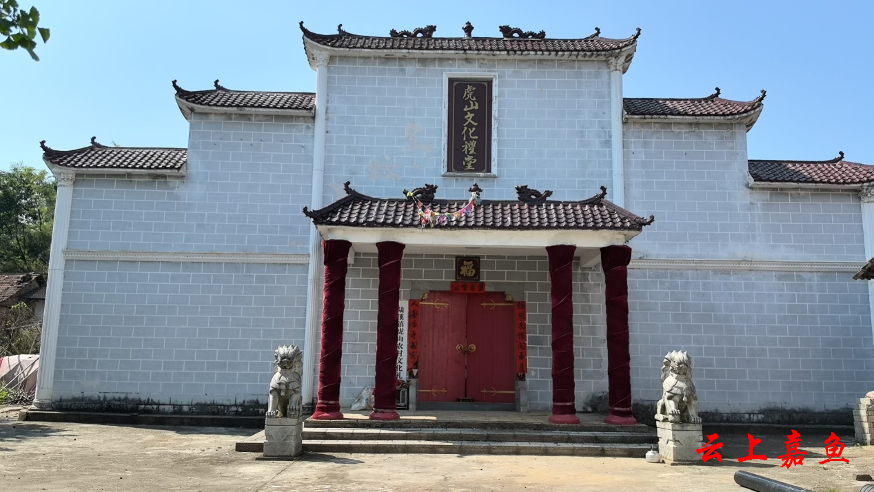 虎山文化礼堂建于1960年左右,占地面积712平方米,后重新修缮保留原有建筑风貌,红色大门,内外墙古典装饰,既保持原有的古典建筑风格,又增添现代之气派。