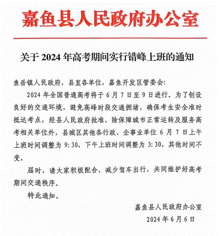 关于2024年高考期间实行错峰上班的通知