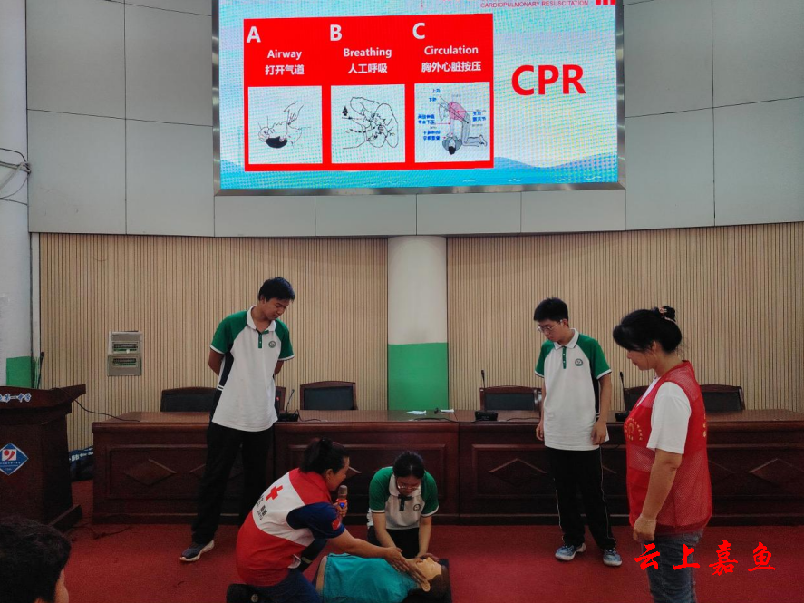 随后,现场还模拟了心肺复苏,进行了应急救护示范,并邀请了几名同学上台展示。整个过程,围绕安全自护教育,做到理论和实践相结合,气氛热烈,操作性强,同学们受益匪浅。