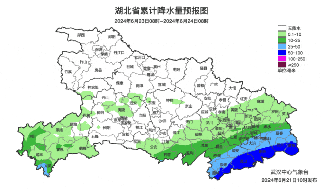 6月21日,湖北省自西向东逐步转为大到暴雨、局地大暴雨、单点特大暴雨。白天,鄂西南大到暴雨,恩施局地大暴雨;江汉平原、鄂东北西部阴天转大到暴雨,荆州西部、随州、孝感等局地大暴雨。傍晚开始到夜间,暴雨区扩大至鄂东地区,荆州、武汉、黄冈局地大暴雨。