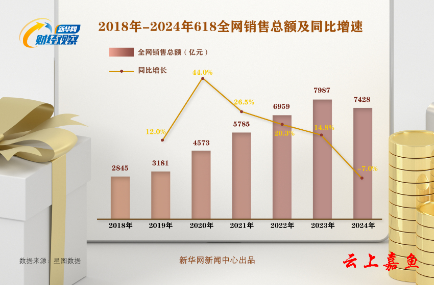 根据星图数据,今年“618”全网销售总额为7428亿元,而去年为7987亿元,同比下降7%。其中,综合电商天猫、京东和拼多多共5717亿元,同比下降6.9%。