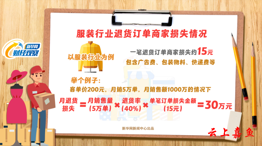他算了一笔账,服装行业一笔退货订单,在没有收益情况下要付出成本约15元,等于广告费、包装物料、快递费的投入直接打水漂。如果按照销售1000万元,客单200元,保守算40%退货,因退货产生的损失达30万元以上,连带成本每月损失过百万。
