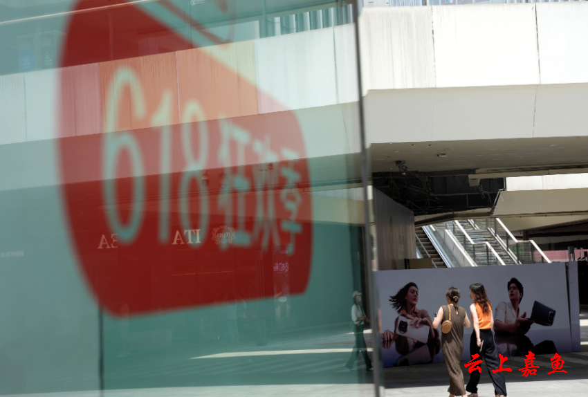 2024年6月18日,行人从杭州一家商场外的“618”活动宣传语附近走过。 新华社记者 韩传号 摄