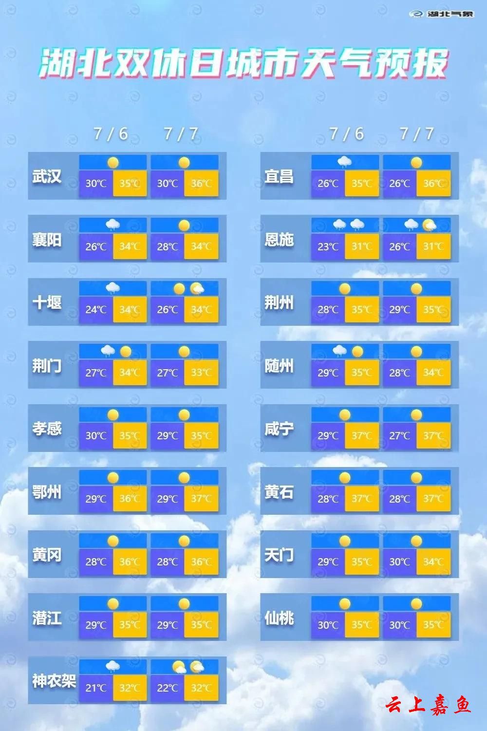 今天(7月7日)6时45分 武汉中心气象台发布 高温黄色预警 预计今天白天,十堰南部、襄阳中西部、宜昌、荆州、天门、潜江、仙桃、孝感、武汉、黄冈、黄石、鄂州、咸宁最高气温将升至35℃以上,部分地区37℃以上。 防御指南:1.有关部门和单位按照职责做好防暑降温准备工作;2.午后尽量减少户外活动;3.对老、弱、病、幼人群提供防暑降温指导;4.高温条件下作业和白天需要长时间进行户外露天作业的人员应当采取必要的防护措施。 来源:湖北发布、“湖北气象”微信公众号