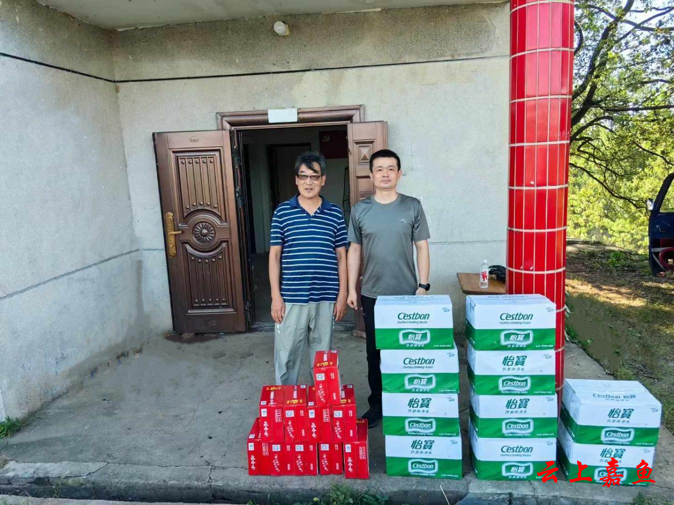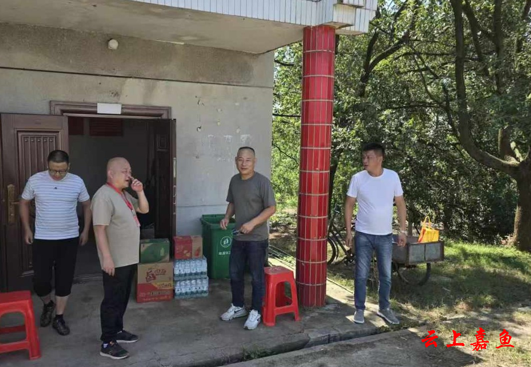 7月5日,嘉鱼县嘉众新型环保材料有限公司负责人熊继华、孙昆到陆溪镇长江干堤哨所慰问一线防汛人员。