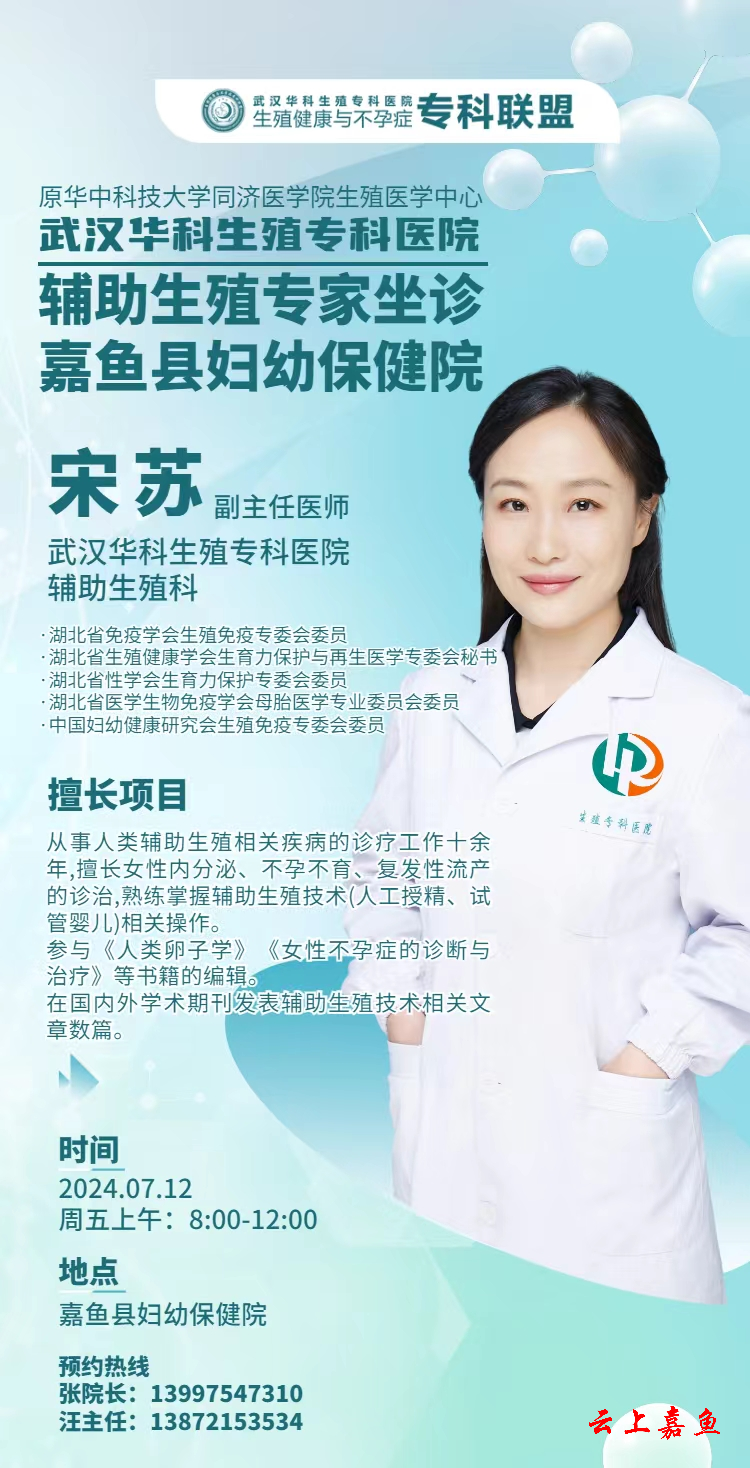 为进一步落实嘉鱼县适龄人群生育力普查与生殖健康促进项目,提升适龄人群生殖健康水平与生育能力,嘉鱼县妇幼保健院将于2024年7月12日(星期五)邀请武汉华科生殖专科医院(原华中科技大学同济医学院生殖医学中心)专家来院坐诊,进行生殖健康的咨询、初步筛查和诊断,及常见病、慢性病的诊治和预防。