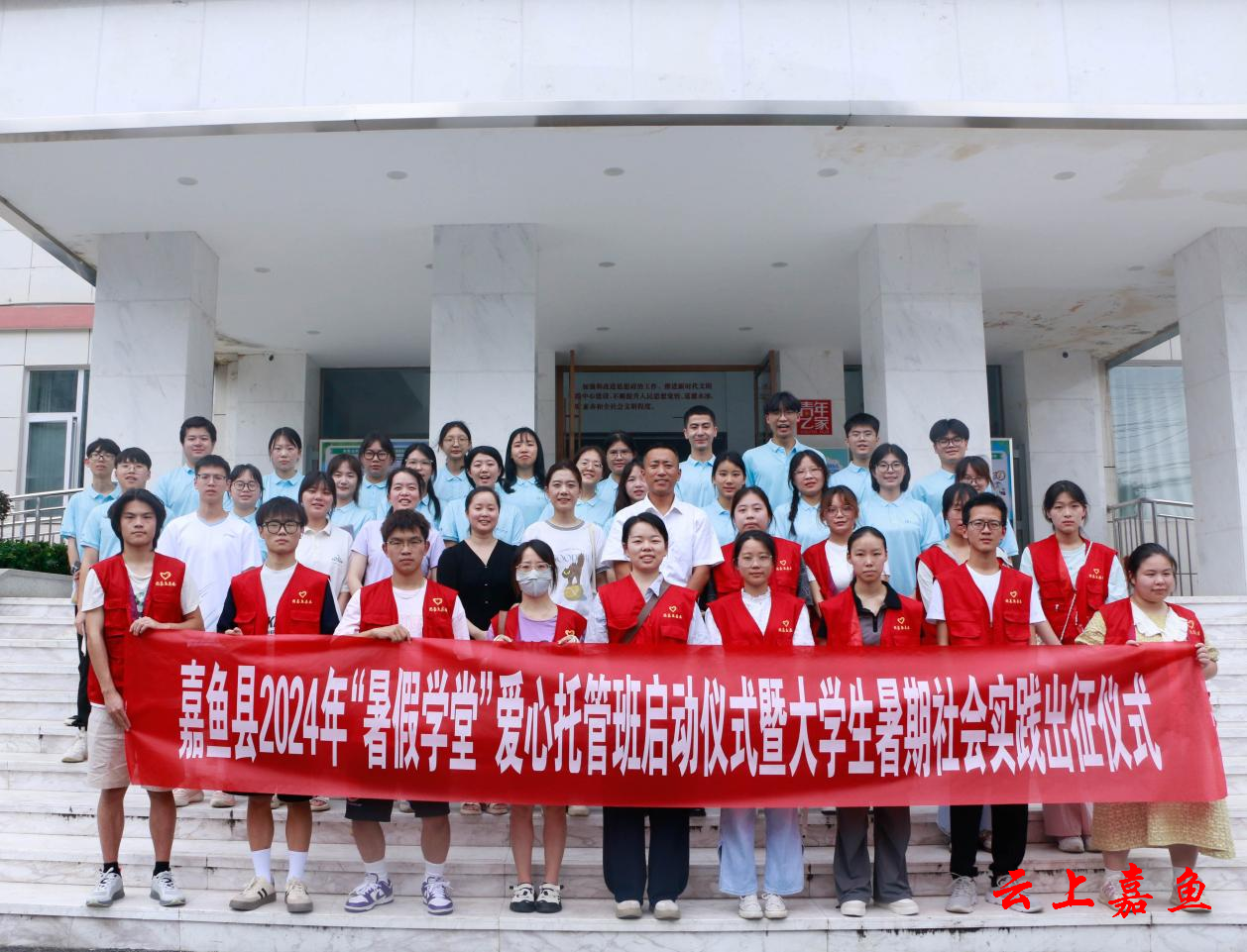 云上嘉鱼报道(通讯员杨远思)7月9日,我县“暑假学堂”爱心托管班启动仪式暨大学生暑期社会实践出征仪式在县新时代文明实践中心举行。团县委全体成员、湖北工业大学计算机学院青佑之光暑期社会实践队的同学们和返乡参与“暑假学堂”爱心托管班的大学生志愿者们共同参与。