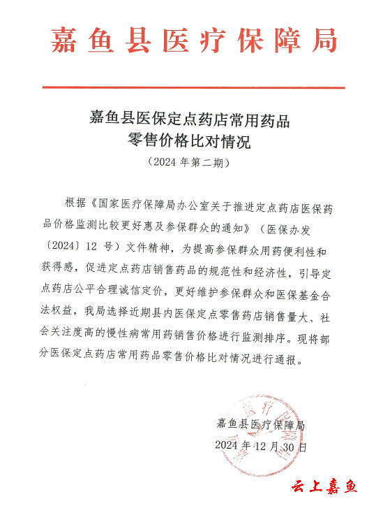 嘉鱼县医保定点药店常用药品零售价格比对情况