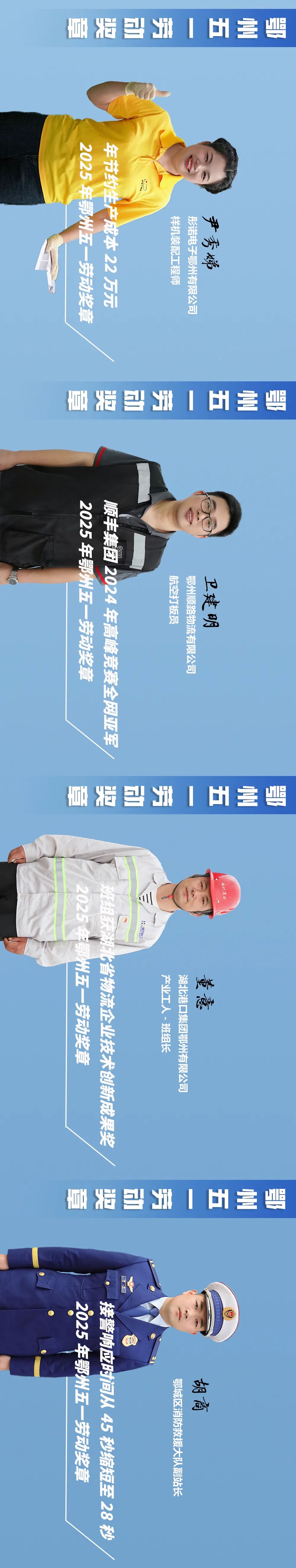 鄂州市恒基智能装备制造有限公司班组长肖红经常为客户24小时抢修,湖北三超物流有限公司业务主管严基华累计运输预制梁500多件、20多万吨,鄂州市中心医院胃肠外科主任汤俊一年耐心细致地接诊了1500余名患者、完成了400余台手术,梁子湖区太和中学教师邓丽坚守乡村教育25年、近几年引领志愿教师们开展了近600场公益课堂活动,鄂州市公安局出入境支队一大队大队长胡孝睿坚守出入境窗口10年,受理业务20万余件、发现案件线索367条……
