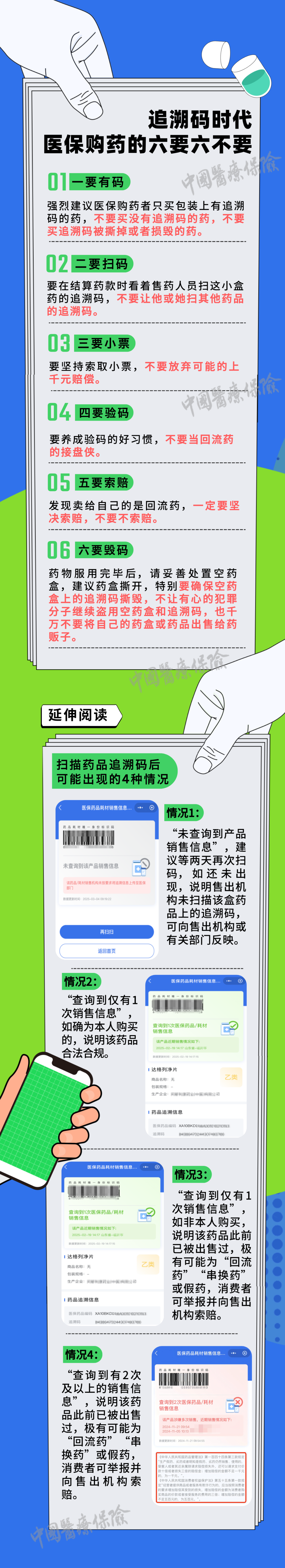 转卖药品会对他人造成危害,自己和家人也有可能买到“回流药”“串换药”或假药;另一方面,药品在被非法转卖时,其他购药者也能通过扫描药品追溯码,把您的卖药行为暴露在光天化日之下,将会给您的医保待遇带来巨大不利影响,严重的还可能涉嫌违法犯罪,得不偿失!