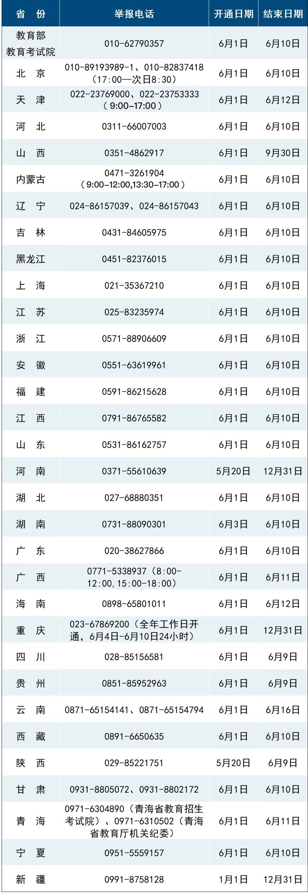 2025年高考将于6月7日开考。近日,教育部统一公布了教育部以及各省(区、市)2025年的高考举报电话。 教育部相关部门负责人表示,欢迎广大考生、家长及社会各界人士及时举报反映涉及2025年高考的问题线索。教育部及各省(区、市)将会同有关部门根据举报线索第一时间核查处理,坚决维护高考公平公正。 来源:央视新闻