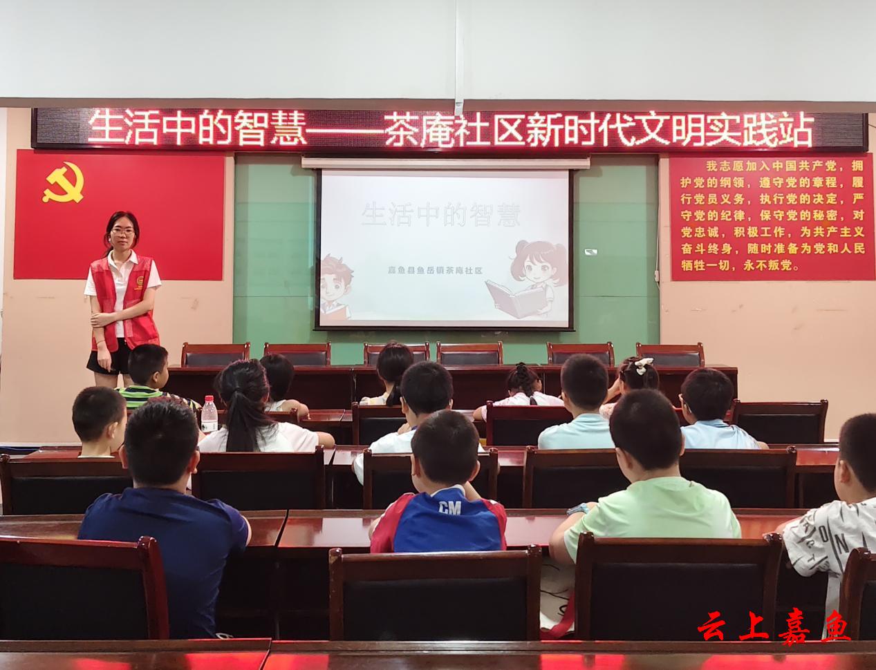 云上嘉鱼报道(通讯员张嘉丽)“夏天吃冰要适量,空腹喝冰饮容易肚子疼哦!”“过马路时要记住‘一停二看三通过’,不闯红灯不追逐打闹。”7月29日,鱼岳镇茶庵社区新时代文明实践站与社区团委联合开展“生活的智慧”主题讲座,为孩子们讲授饮食、安全、卫生、环保与情感交流等方面的知识。